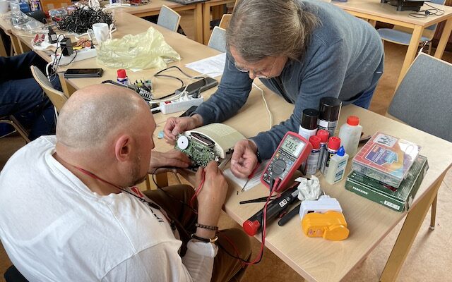 Sogar die metallene Aufnahme einer Brotbackmaschine konnte wieder gangbar gemacht werden, so dass das Gerät wieder genutzt werden konnte. Gleiches galt für die inzwischen fast obligatorischen Reparaturen eines CD-Spielers und Radios. Auch Anfragen zu Fahrrädern waren dieses Mal dabei, von denen zumindest eine erfolgen konnte. Für komplexere Fahrradreparaturen, verwiesen wir an das Team der Sonntagsdialoge.